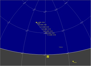 日付 時刻 方角 高度(度) イベント 1-15 20:00 西 5 -15 マップス彗星が見頃になる可能性大 7-11 4:30 東 5 -10 パンスターズ彗星が見頃になる可能性大 ![]()