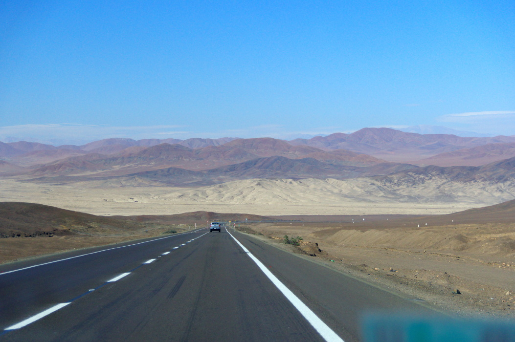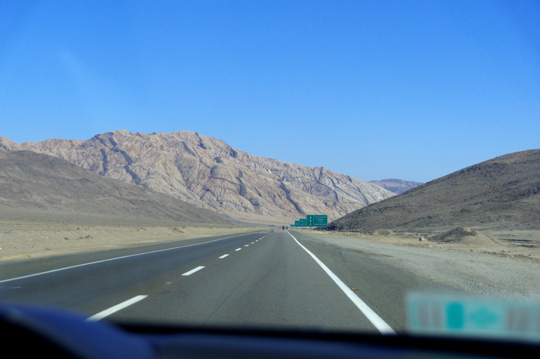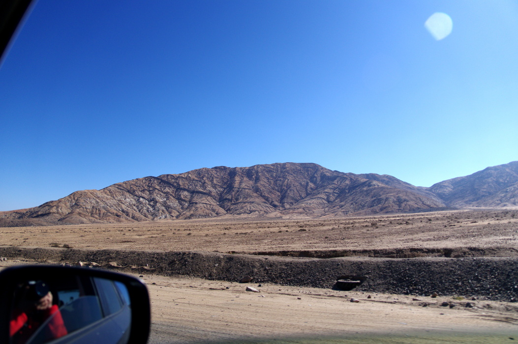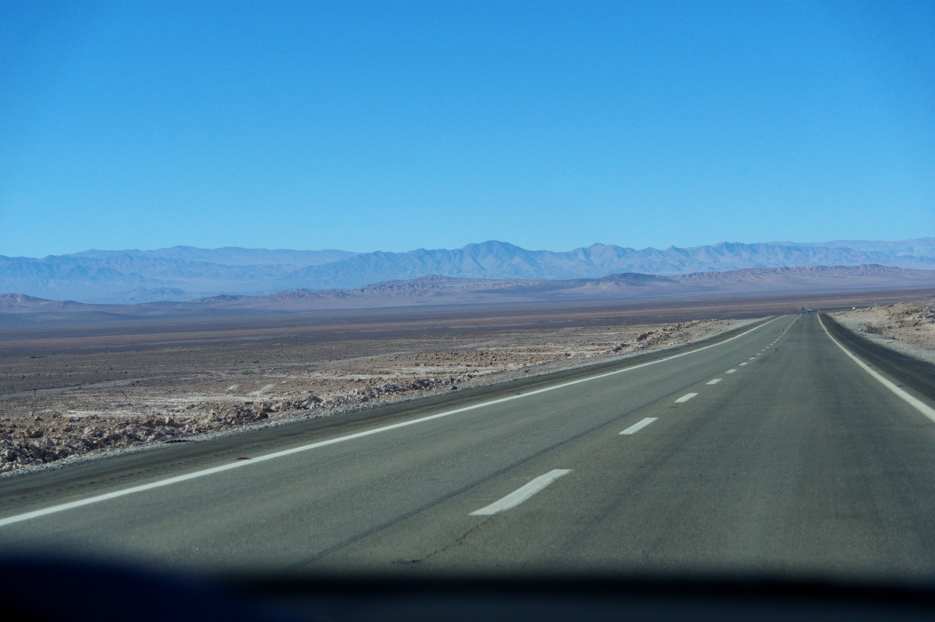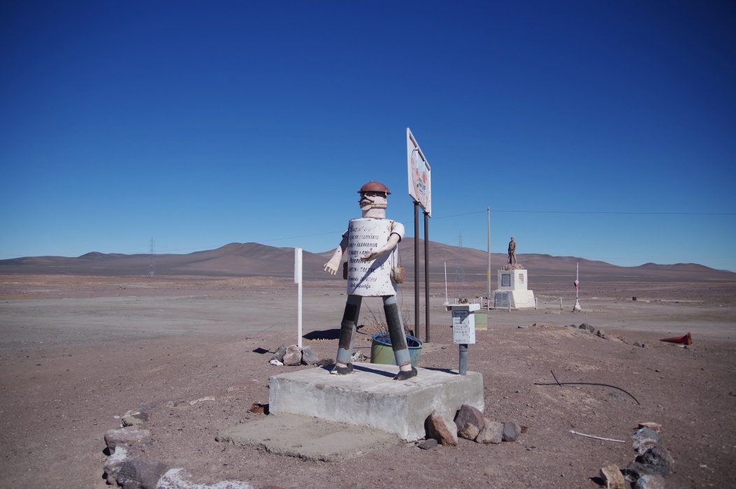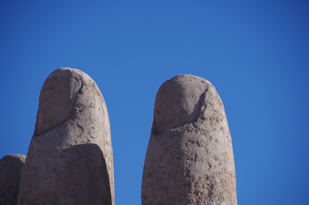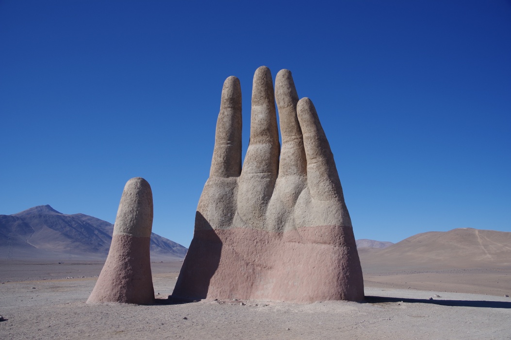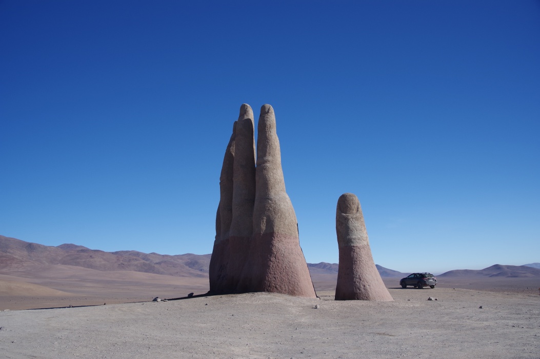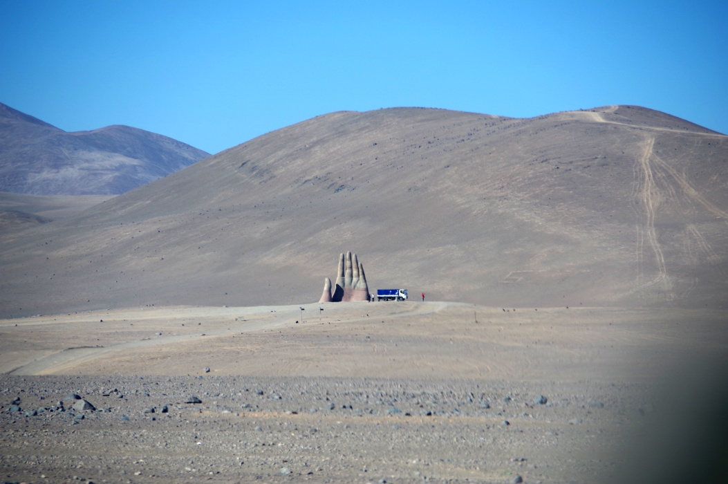 更に南へ向かいます。 行きはパラナル天文台を見る為に一号線を走りましたが、帰りはパンアメリカン・ハイウェイを走ります。 アントファガスタのスモッグを出ると、冬の青空が広がります。 途中で見れるものと言ったら大きな手のオブジェ「マノ・デル・デシエルト」だけです。 この日はひたすら砂漠の中を走りました。