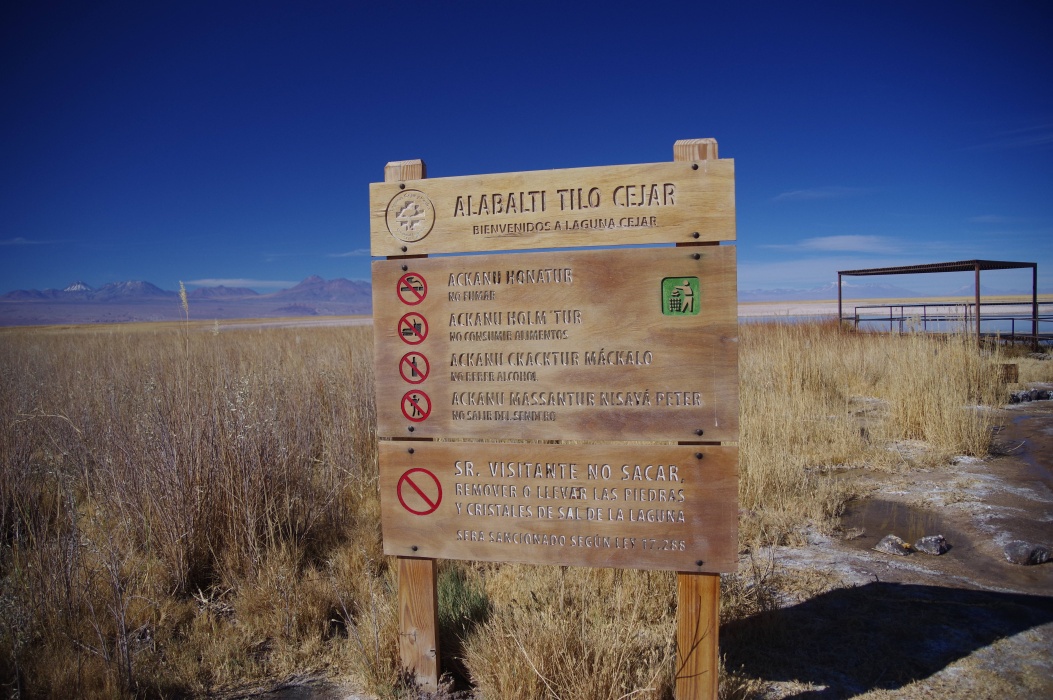 第一日目は村の周辺からの散策です。 ALMA天文台の見学予約が取れなかったので、観光客となる事にしました。 この日はセハール湖とムーンバレーを見ました。 チリの観光地は必ず番人(現地のインディオ)が居て、絶えず観光客を監視しています。 それなりに何処も奇麗で整備され、トイレ等も清潔です。