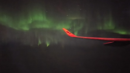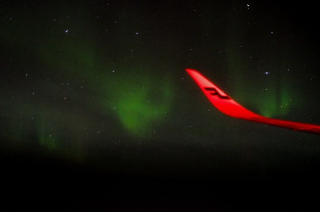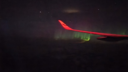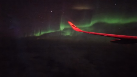 夜23時発だった為かなり爆睡していて、ふと目が覚めた時に外を見ると、オーロラが舞っていました。