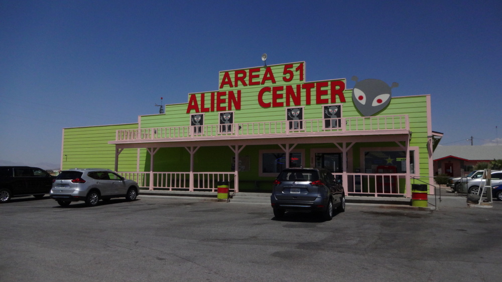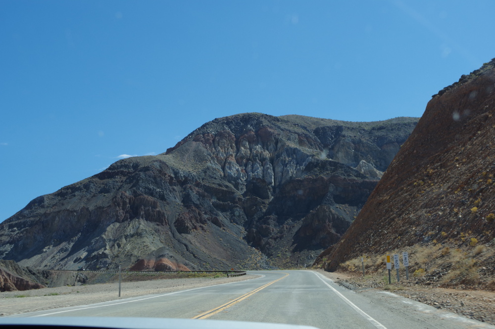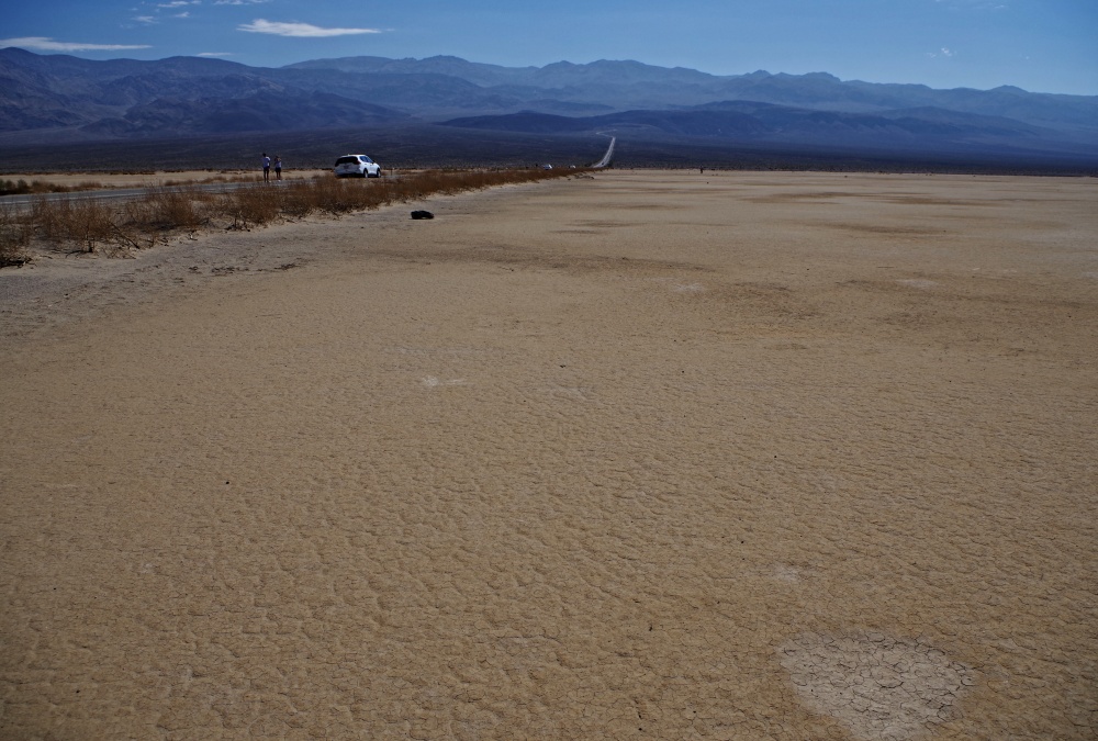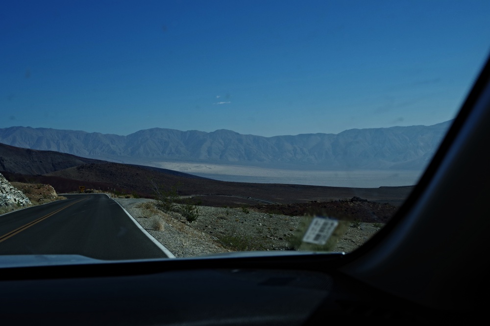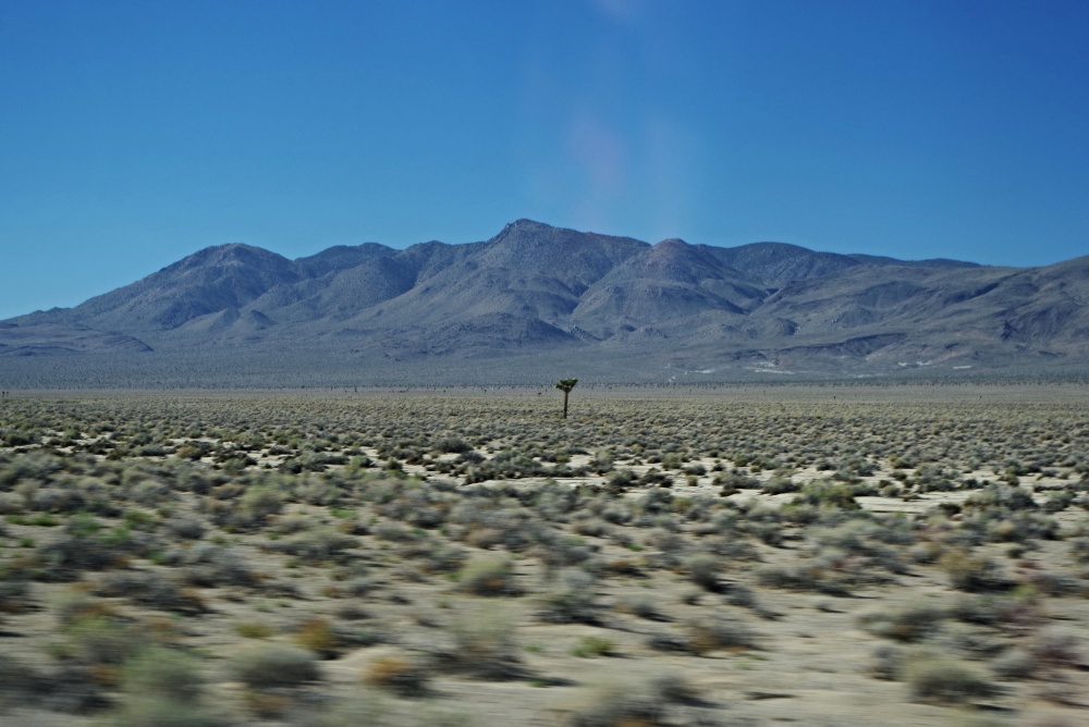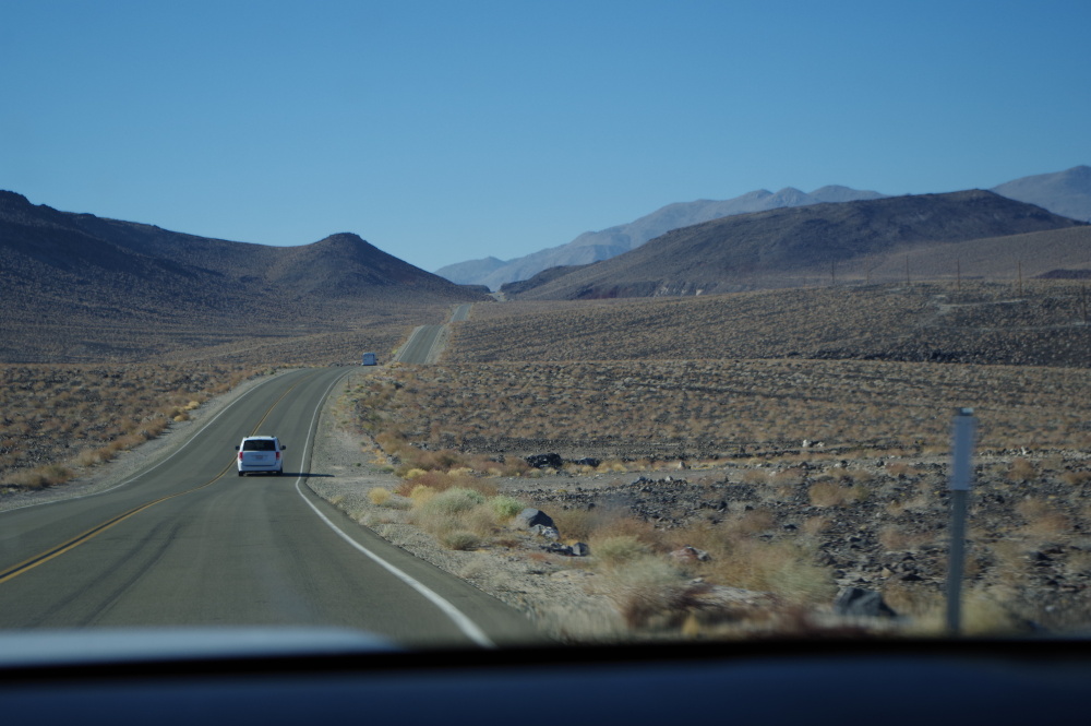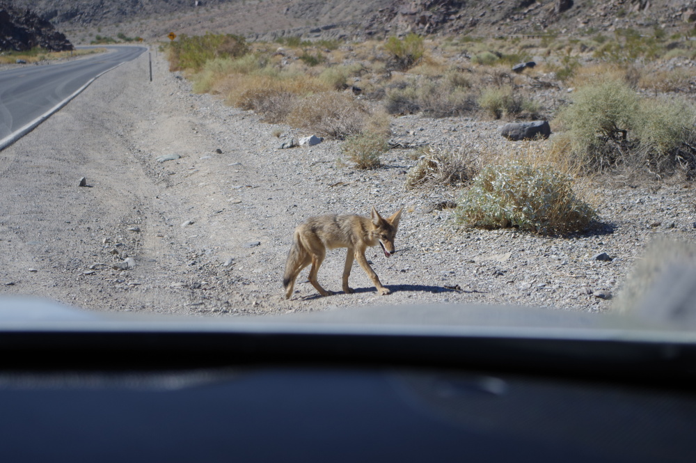 デスバレー。年に一度雨が降るか降らないかと言われる乾いた砂漠。はるか彼方に塩に覆われた谷底が見える。余りの暑さに負けて、見に行くのは止めました。こんなところにコヨーテが。あんなに痩せちゃって、かわいそう。谷底を横切る一直線の道路。猛暑。10分車から降りて写真を撮れば十分。逃げるが勝ち。からから…カラカラ…からから…火山灰と溶岩の山デスバレーは車の耐久度をテストする場所でも有る。外からは何処の車か分からない様にカモフラージュ。摂氏43度。砂丘暑い時は砂丘への立ち入りは禁止。からから…UFOで有名なエリア51。エイリアンの土産物屋。