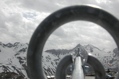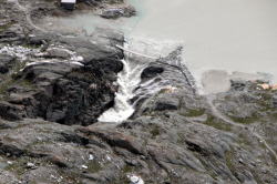 グロース・グロックナー山頂 3798m 氷河から溶け出した水が滝となって流れ出る。 ここにも橋が架けられ、ハイキングコースとなっている。 |