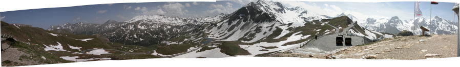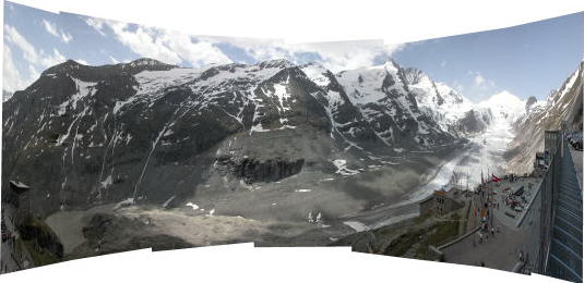 山頂のレストラン(昔は山小屋だった) 矢の先がグロース・グロックナー |