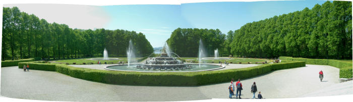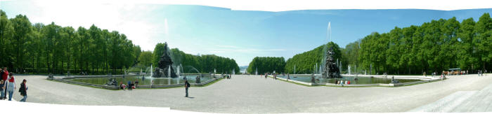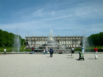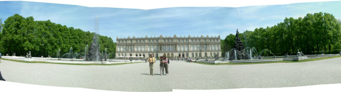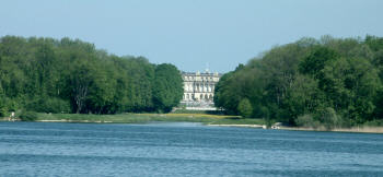 キーム湖 Chiemsee ヘーレンキームセー城 フランスのルイ14世にあこがれていたルートヴィヒ2世はこのヴェルサイユ宮殿のコピーをキーム湖の島に築きました。内装は豪華絢爛。一度も使われていない鏡の間はオリジナルより22m大きいそうです。この城を築く為に当時20億マルクと言う税金を使いました。これはノイシュバンシュタイン城とリンダーホーフ城をたした金額より多い額です。 中庭からプリーン市が見える
