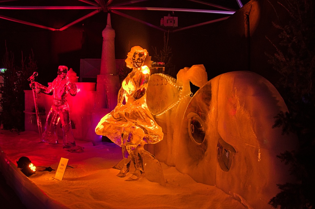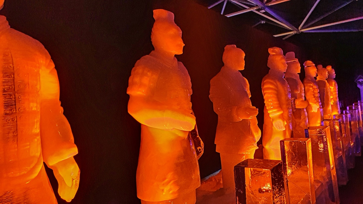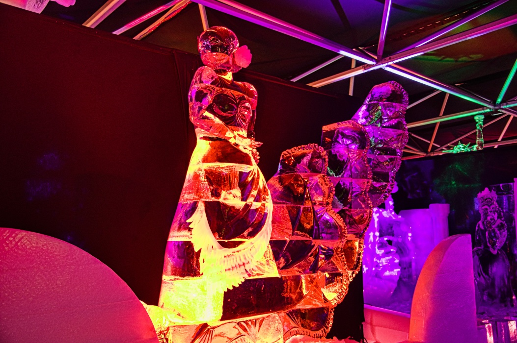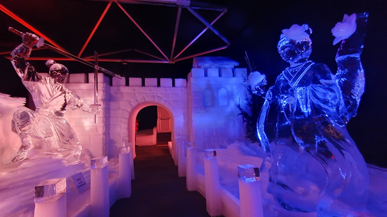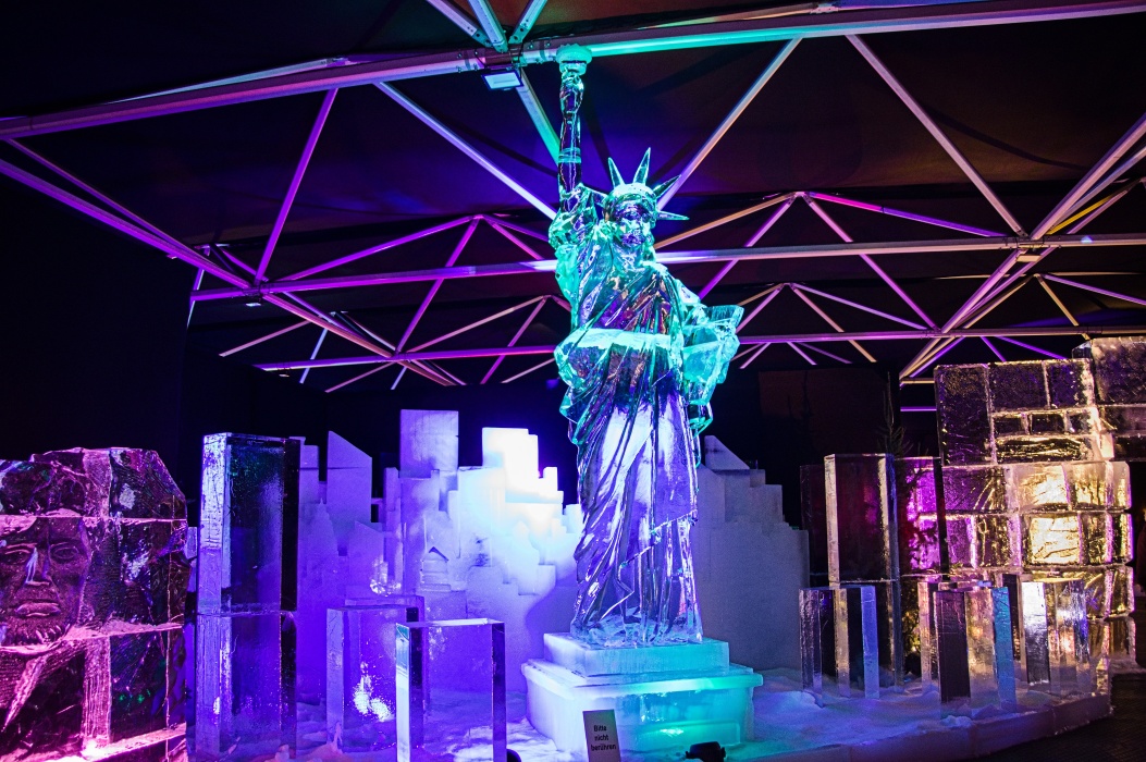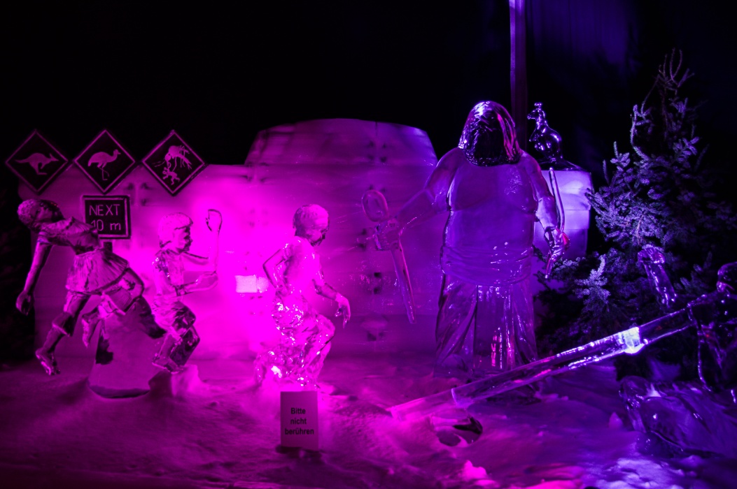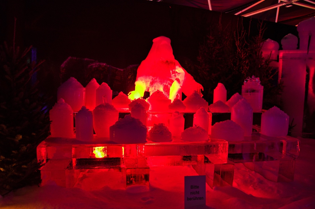 ノルトライン・ヴェストファーレン州オーバーハウゼン(Oberhausen)で世界最大級のアイス&スノー彫刻展が開催されています。 35人の国際アーティストがおよそ200トンの雪と約500個の異なるサイズの氷のブロックをチェーンソー、ドリル、ノミ、アイロンなどを使って造られた氷像が、-8℃迄冷却した会場に展示されています。 毎回テーマを変えている展示会ですが、今回のテーマは「世界旅行」。 様々なシーンやクリスマスの作品、有名な建造物、歴史的人物が展示されてます。