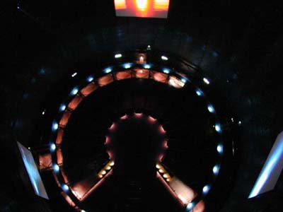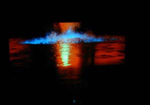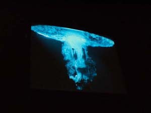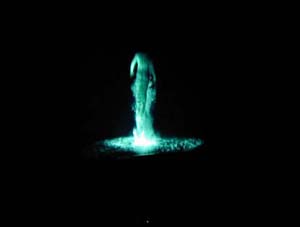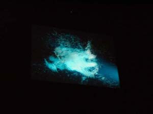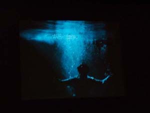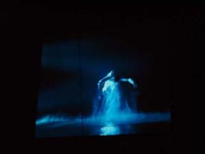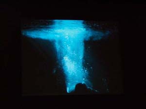 “5人の天使”と名づけられたこの展示会。ガソメータの内壁に5枚の18x15mの巨大なスクリーンが張られ、そこに高速度撮影されたビデオが投影される。水面、水中にカメラが設置され、5人の天使が飛び立ってゆく様子が見られる。