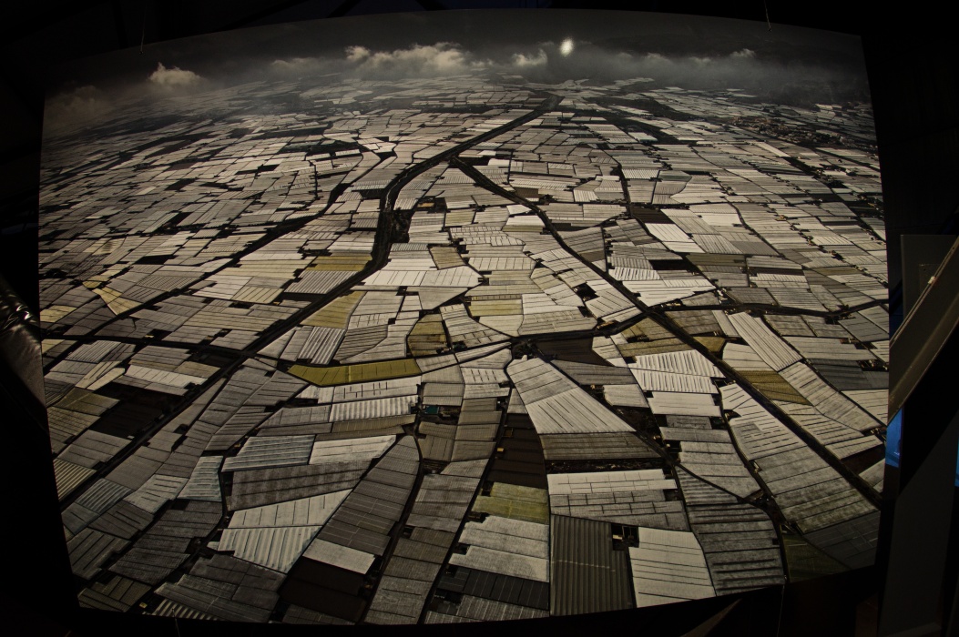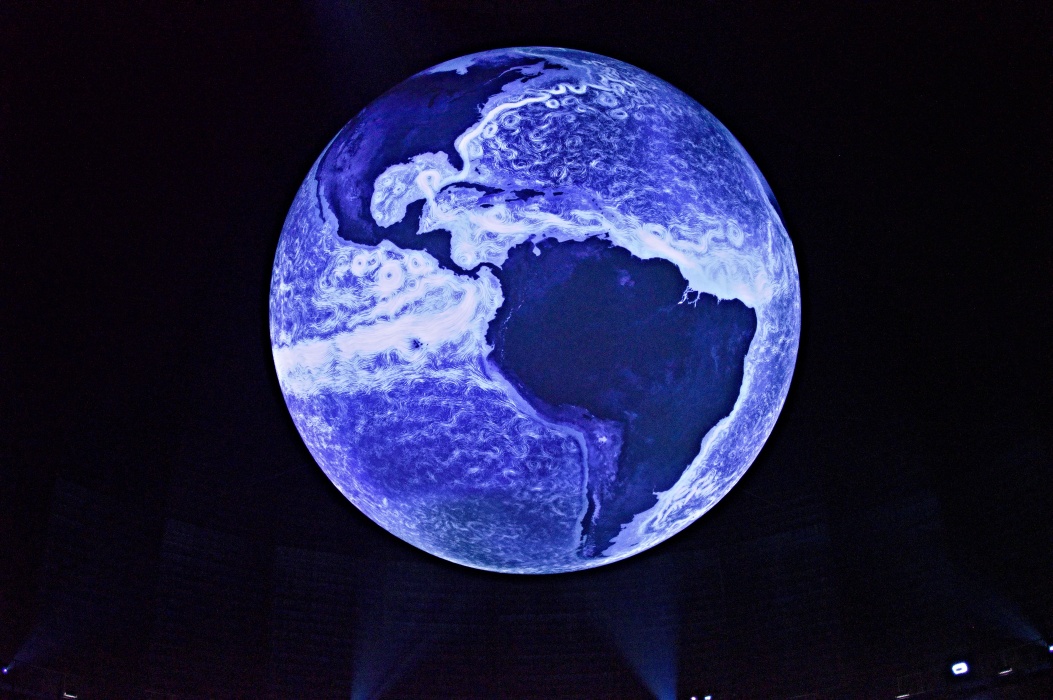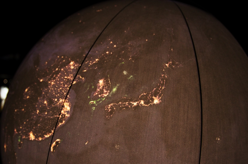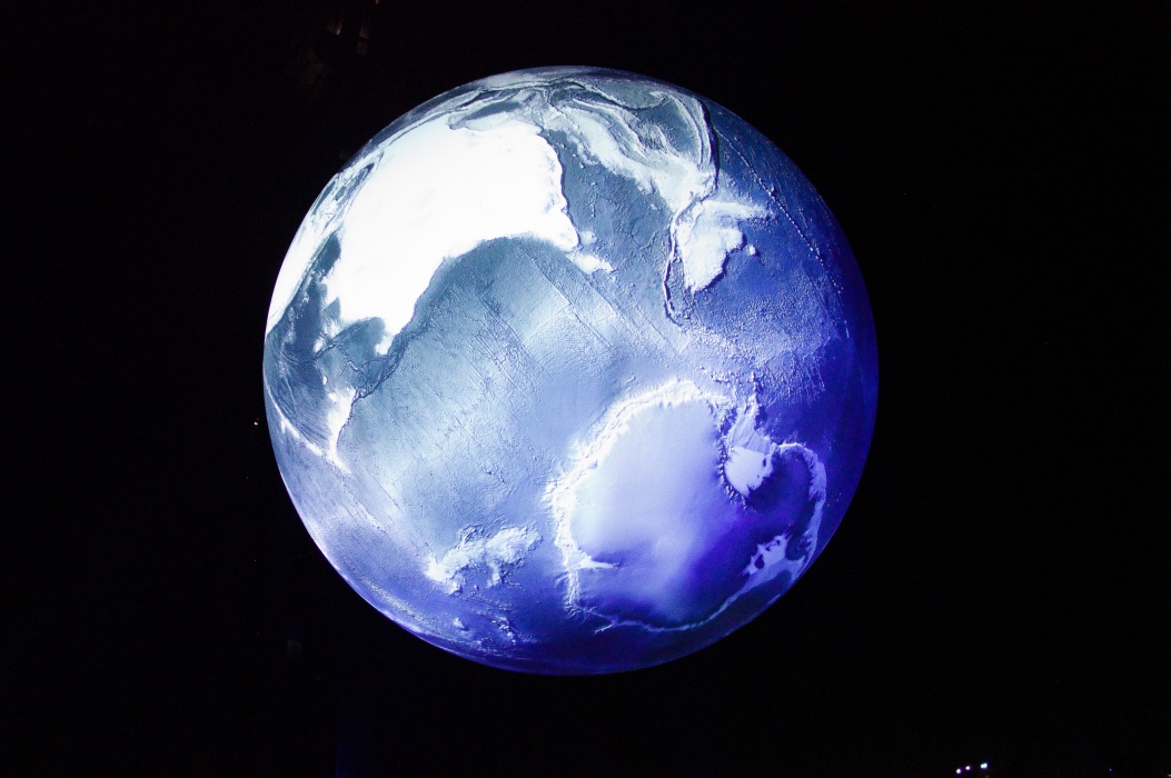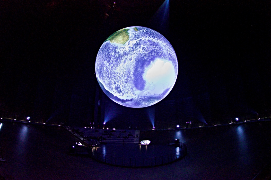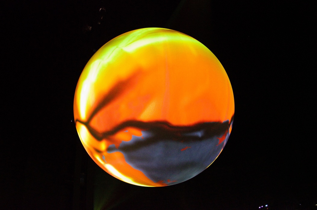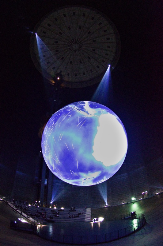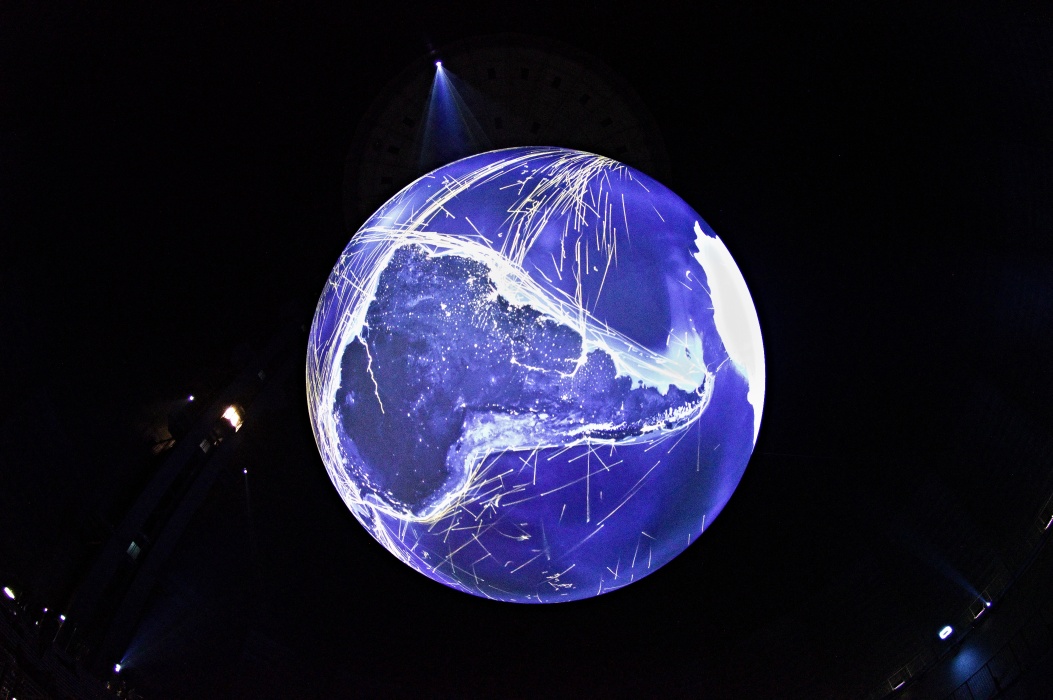 今回のテーマは壊れやすい楽園です。 大きな球形の風船を天井から吊るす展示会は2016年にも有りました。 今回は日の満ち欠けだけでは無く、空路や航路等の人間の活動も再現した投影でした。 地上階のギャラリーには動物の写真、一階には破壊された自然の写真が展示されていました。