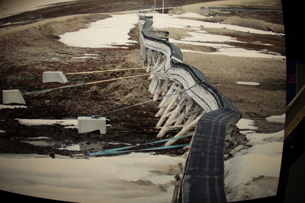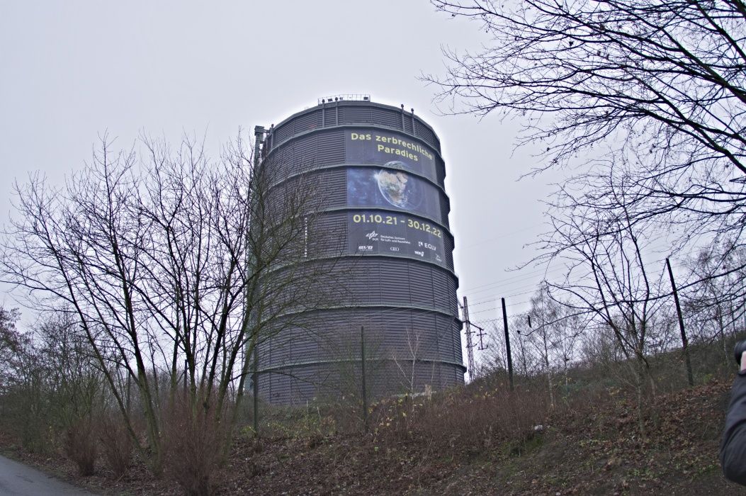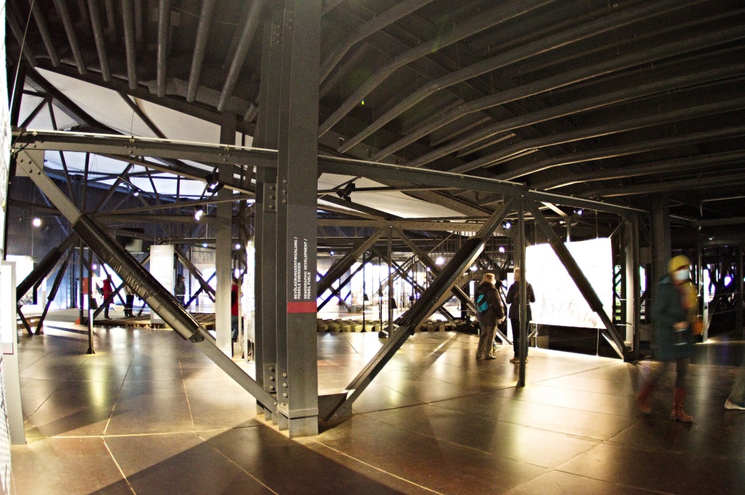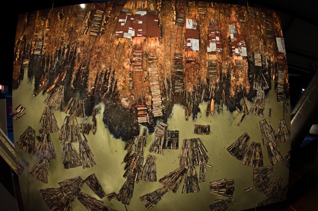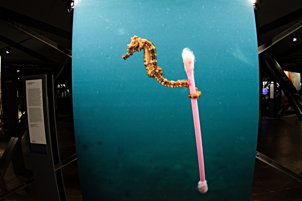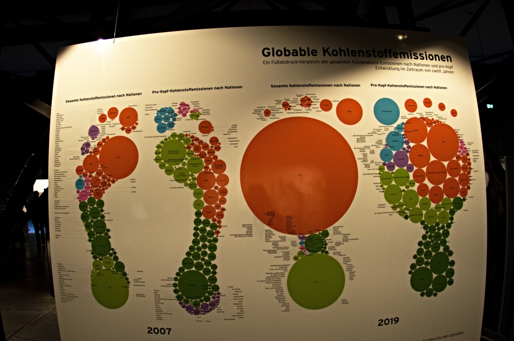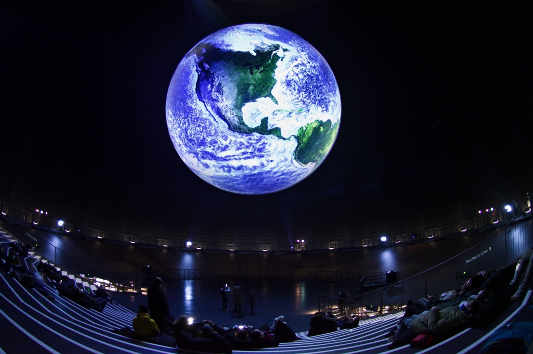 今回のテーマは壊れやすい楽園です。 大きな球形の風船を天井から吊るす展示会は2016年にも有りました。 今回は日の満ち欠けだけでは無く、空路や航路等の人間の活動も再現した投影でした。 地上階のギャラリーには動物の写真、一階には破壊された自然の写真が展示されていました。