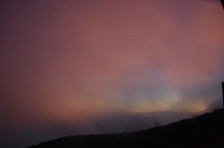 夕焼けが舞う霧に反射してとっても幻想的。 |