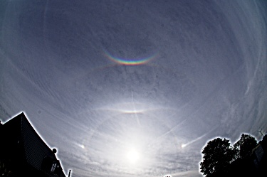 中央は明るい環天頂アークと右にアッパータンジェントアークとそれに接続する上部ラテラルアークが見える |