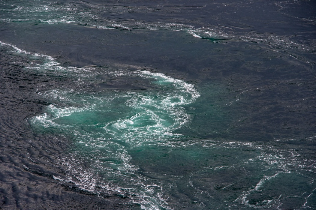 約 6時間ごと に潮の干満が入り替わり、外海から内海へ、またはその逆方向に大量の海水が流れ込んだり流れ出したりして、直径約 10 メートル、深さ約 4–5 メートル に達する渦が発生します。