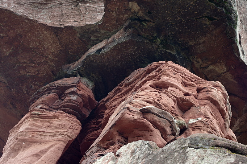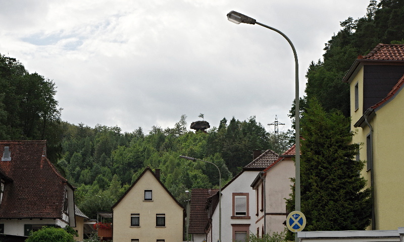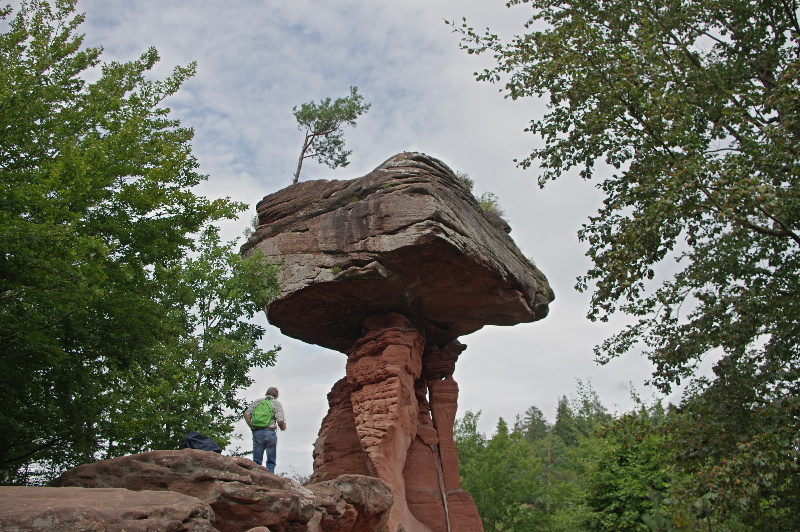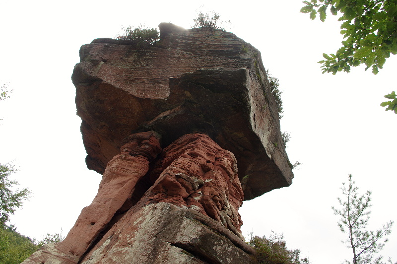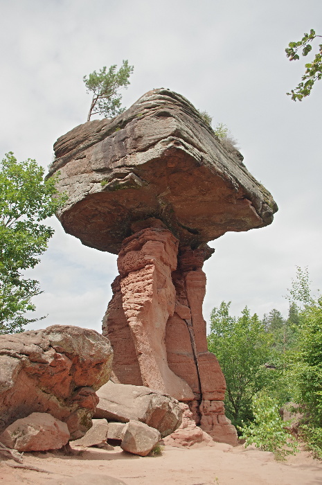 トイフェルスティッシュはドイツ語で「悪魔のテーブル」と言われ、テーブルのような形をした高さ14メートルの岩です。 2006年にドイツのジオトープに認定され、ファルツ地方の象徴的な役割をしています。 粘土層と砂岩が重なった地層はきのこの様な岩を作りやすく、この地域にはこの様な岩が幾つか見られます。 この岩が今の形になるまでは、およそ2億5千万年ほど掛かっています。