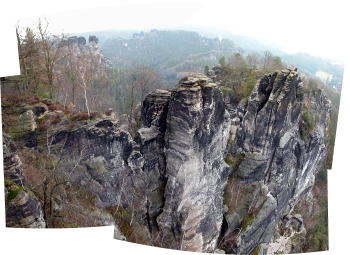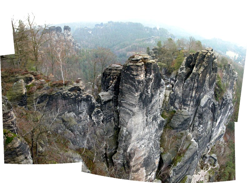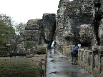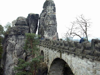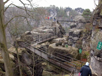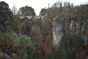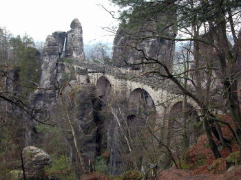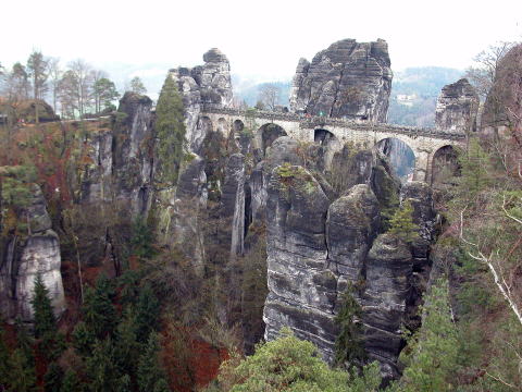 ドレスデンから30km程東へ行った所にバスタイ渓谷があります。 エルベ川の北側にそびえ立つ砂岩の壁はサクセン・スイス国立公園の景勝地の一部です。 侵食された砂岩の頂上を利用して築かれた要塞の歴史は11世紀迄さかのぼります。 当時ボヘミアの領土だったこの地域は13世紀にオルシュビッツ家に買われ、この要塞も騎士の城となりましたが、16世紀には崩壊してしまいました。 お城へ渡る橋も当時は木製でしたが、1851年に石製に造り返られています。 この要塞はドイツで最も美しい光景として有名です。 残念ながらシトシトと雨が降る中の観光でした。 この断崖絶壁にホテルが有ります。そのレストランは値段も高くなく、内容も充実しています。客室も80ユーロ位だそうです。 |