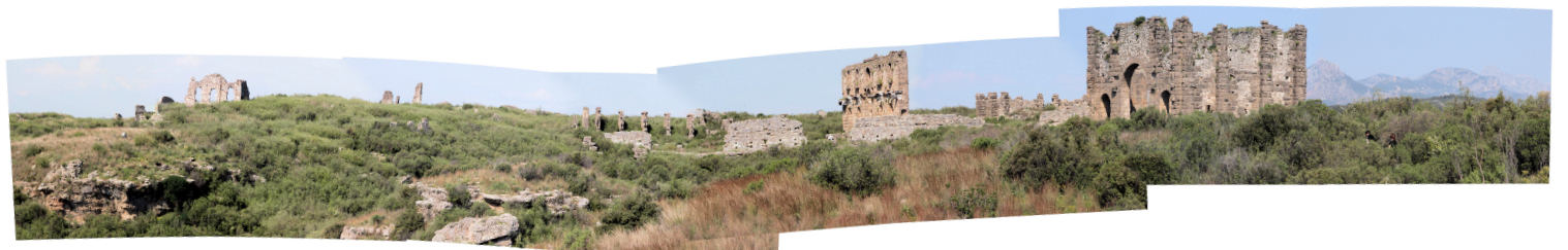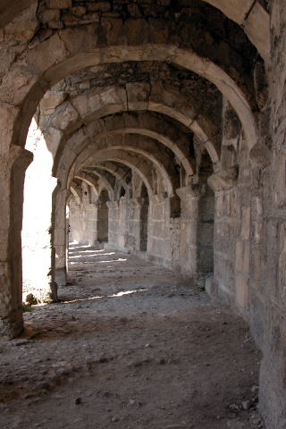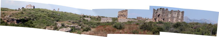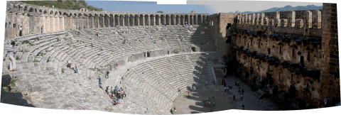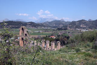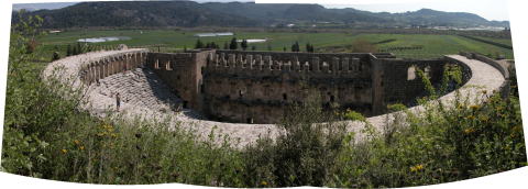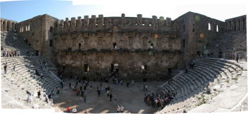地中海に面したアンタルヤ市の東方にアスペンドス遺跡があります。 紀元前2世紀ローマのマルクス・アウレリウス帝のために紀元2世紀に建造されたという歴史をもつこの遺跡にはほぼ完璧な状態で残っている野外円形劇場が有ります。イオニア様式やコリント様式の舞台の壁、楽屋や付属建造物なども当時のままです。 |