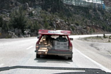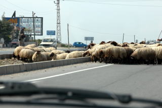 高速道路を横断する羊の群れ | レンタカー。フロントガラスに大きな亀裂。 ドアに水溜り。 |