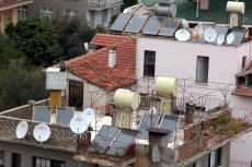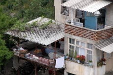 屋上にずらりと並んだアンテナと温水器が目立ちます。 もちろんベランダに洗濯物を干すのは当たり前。ヨーロッパじゃ怒られるのに‥。 |