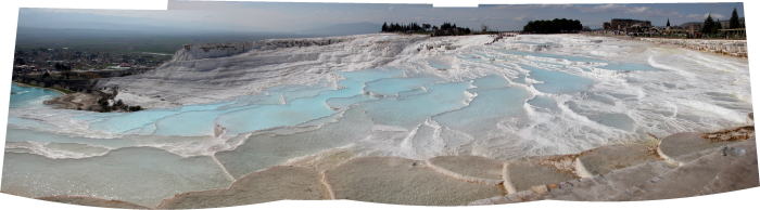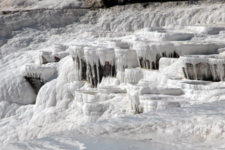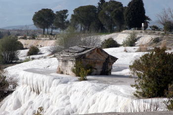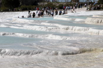写真の石灰棚は観光客用のコンクリートで作られたダミー。 それでも今では石灰分が沈殿し、本物に劣らない素晴らしい自然の造形美です。 ここは土足禁止。裸足で歩き回るのは良いけど、マジに足の裏が痛くなりました。 さて、この名称ですが、日本ではパムッカレ、ドイツではパムッカーレと呼ばれていますが、トルコではパムックカーレが正解だ、と現地人が教えてくれました。 |