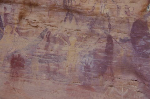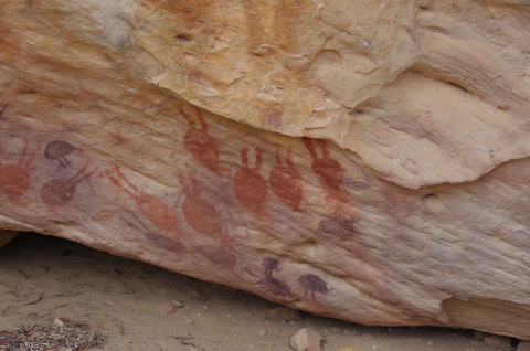 ラウラ町から12km程行った所にアブオリジン・スピリット・ロック(Aboriginal Split Rock)が有ります。 古代のグラフィティー。 何時の時代も落書きは絶えないんですね。 一つ一つ見ていると、古代の人は何を思ってこれを書いたのかなと思います。 面白いので、帰国してから解説書を一つネットで購入しました。 |
