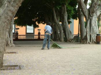 ドラコの有る街。椰子の葉っぱでお掃除。