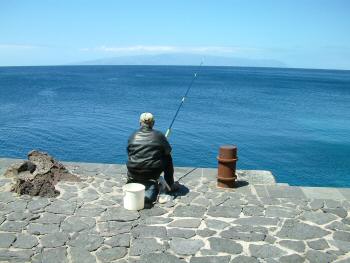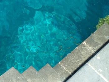 拡大するには写真をクリック。 灯台の下には魚釣りが出来るようにプラットホームが設けられている。海が透明なので、泳いでいる魚が見える。