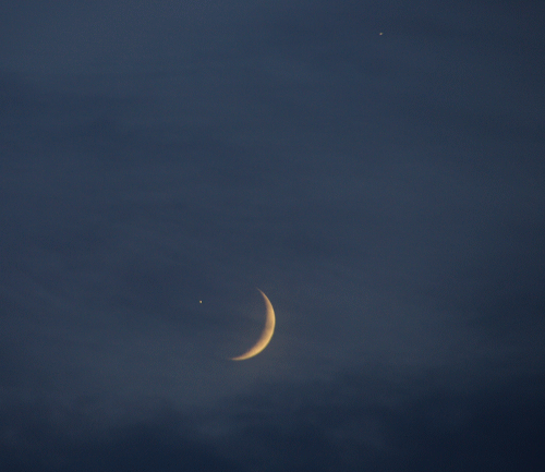 慌てて家に帰り、鞄を放り出して外に出ると、まだまだ雲は多かったですが、何とか地平線上に月と金星が見えていました。その右上には木星も輝いています。