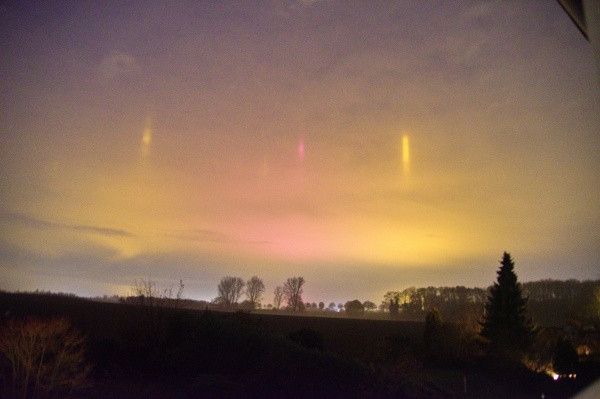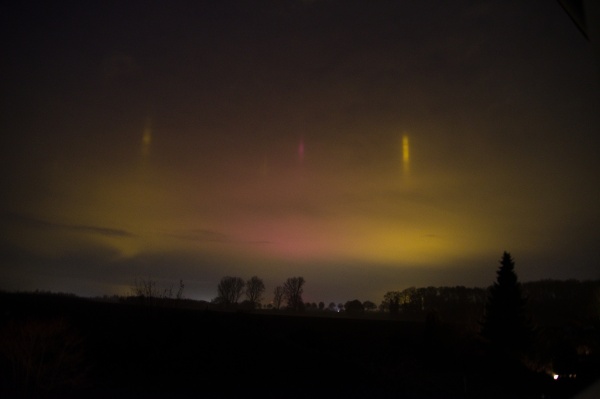 冬の寒い夜光柱現象が見られました。 高原はオランダに有る夜間もこうこうと照らされているビニールハウスです。 下からの光を大気中に水平に漂っている六角板状の氷晶が光を屈折させて観測者の目に届き、それが光柱として認識されます。 雲や霧の中にこれらの氷晶が多いと観測されやすいです。。