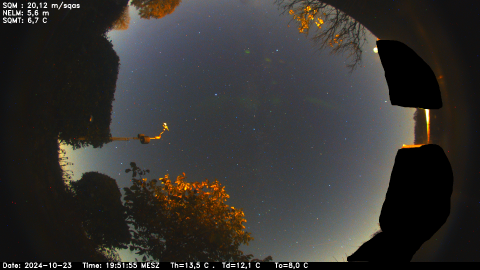 | 既に光度は5等星迄落ち、肉眼では全く見つけられません。双眼鏡でも難しです。 2024.10.25 19:59 35mm/F2,8 ISO1600 5s 写真の上にマウスを置くと、彗星が浮かび上がります。 |