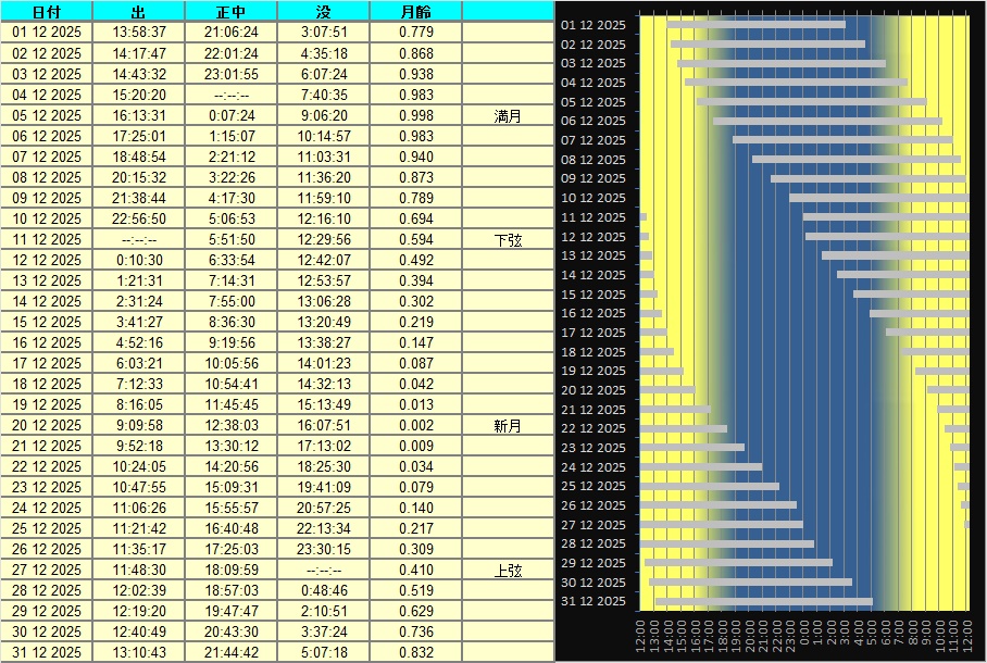 日付 時刻 方角 高度(度) イベント 4 月が近地点(357089km)を通過 7 水星が西方最大離隔 7 20:00 東 10 木星が月に接近(間隔3.6度) 14 ふたご座流星群極大 21 冬至 26 23:00 西 10 土星が月に接近(間隔3.8度)