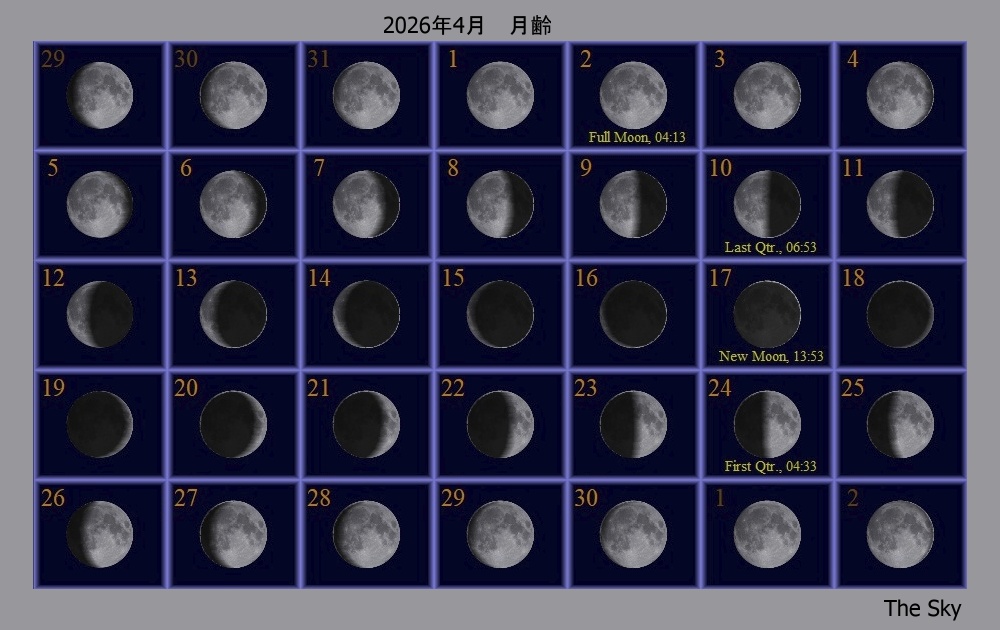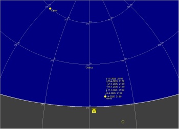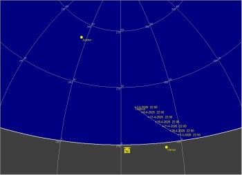 4 水星が最大西方離角 19 月が近地点通過(361633km) 21 こと座流星群(Lyrids)が極大 22 23:00 西 30 木星が月に接近(間隔2.8度) 24 23:00 西 10 金星と天王星ランデブー(間隔0.8度)