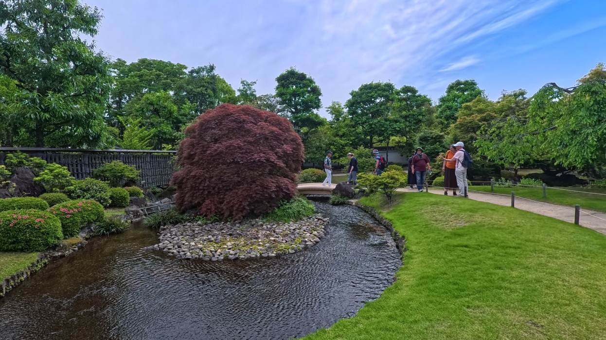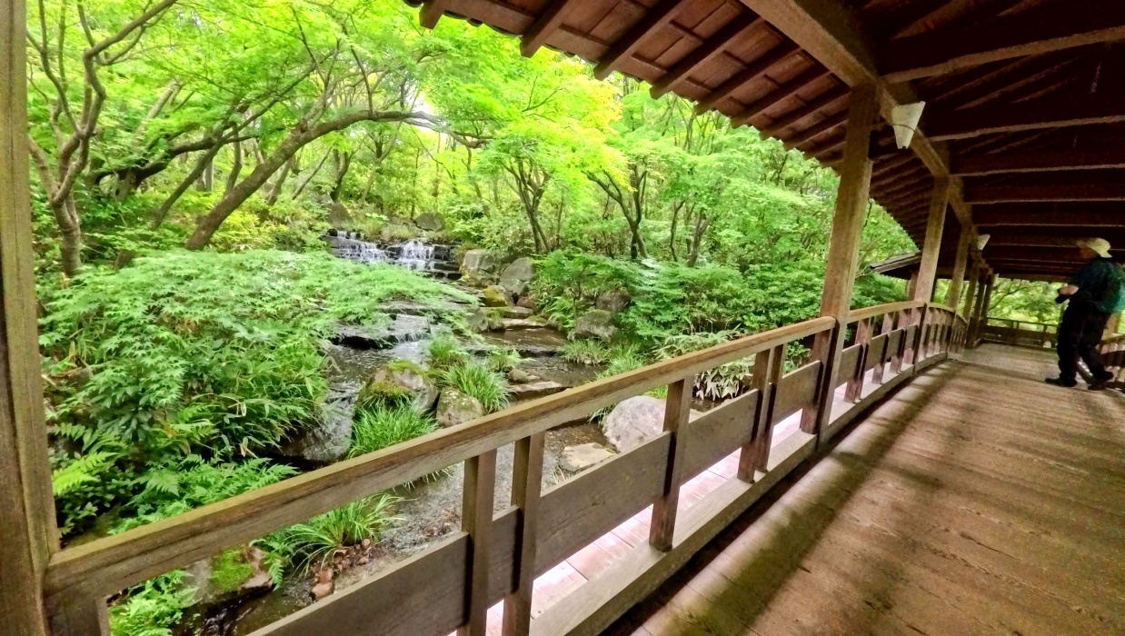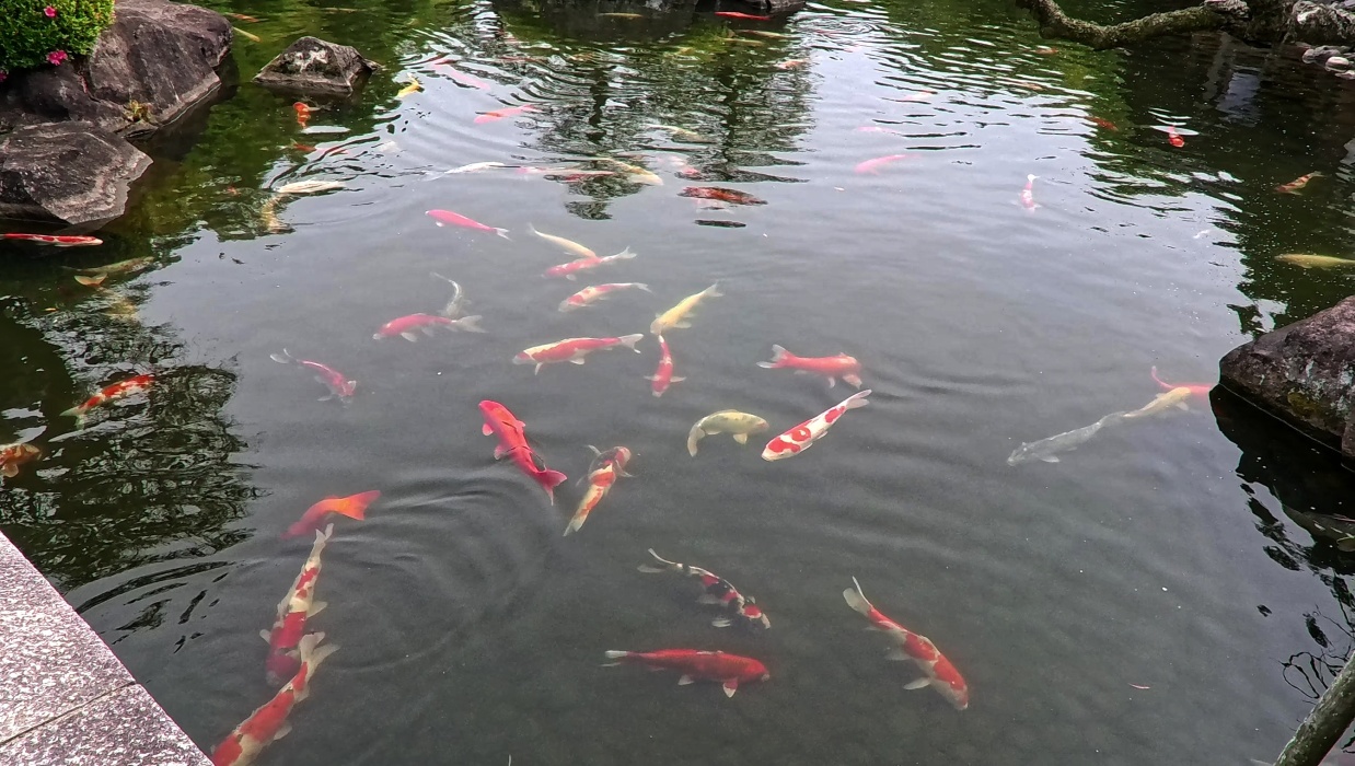 庭園の池にはたくさんの鯉が優雅に泳いでいます。