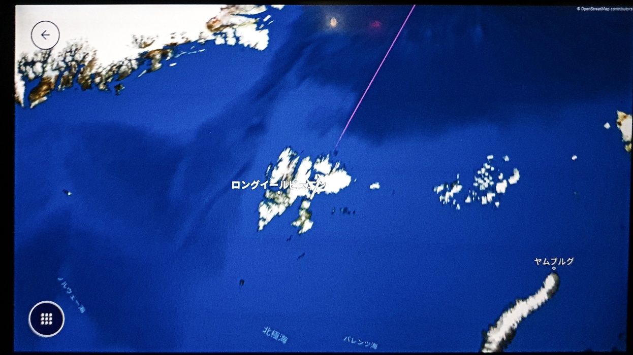 アラスカ上空を通過する時は未だ夜明け前なので、窓から見える素晴らしい景色は見えません。その代わりに、到着4時間前頃には北極の夜も明け、スバルバール諸島を通過する時は氷に覆われた素晴らしい風景が見えました。