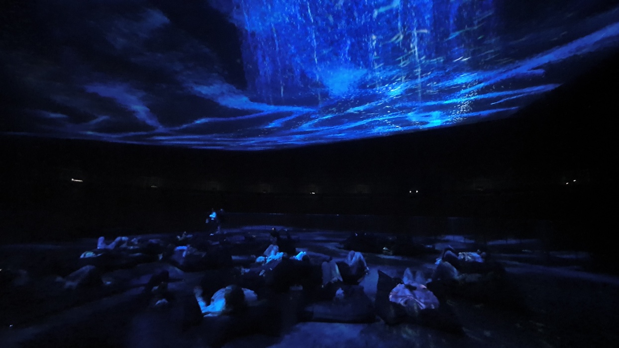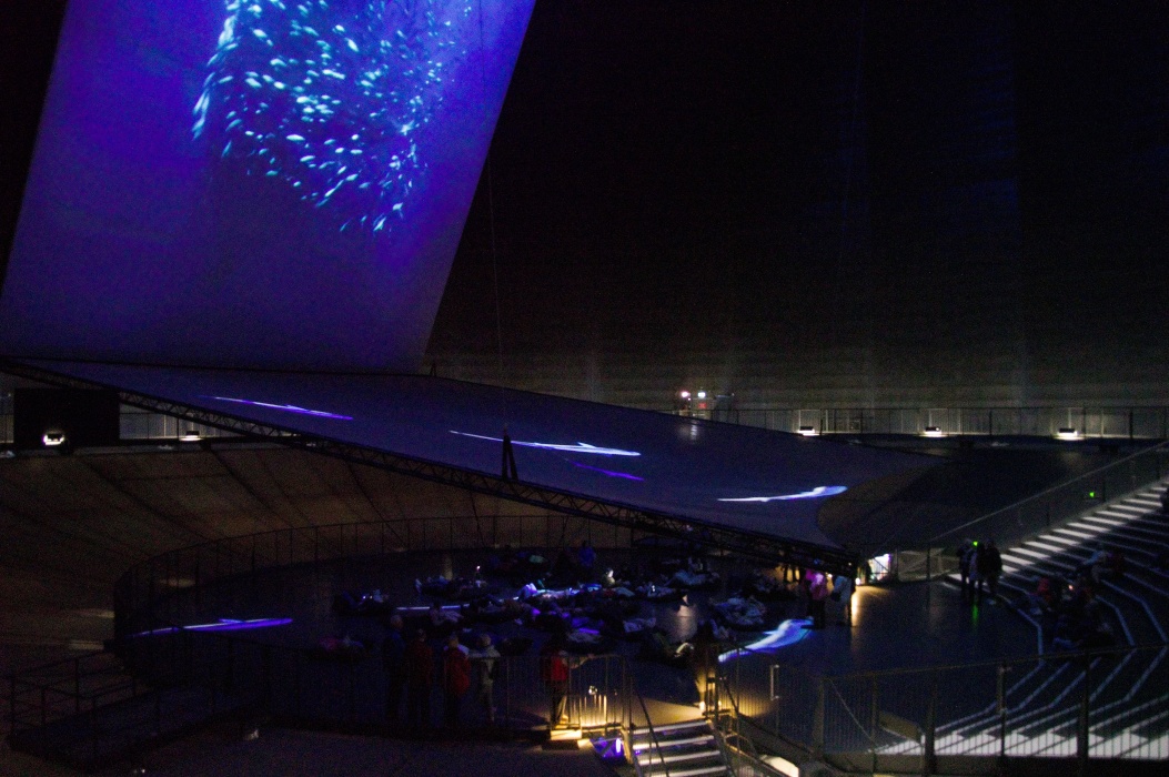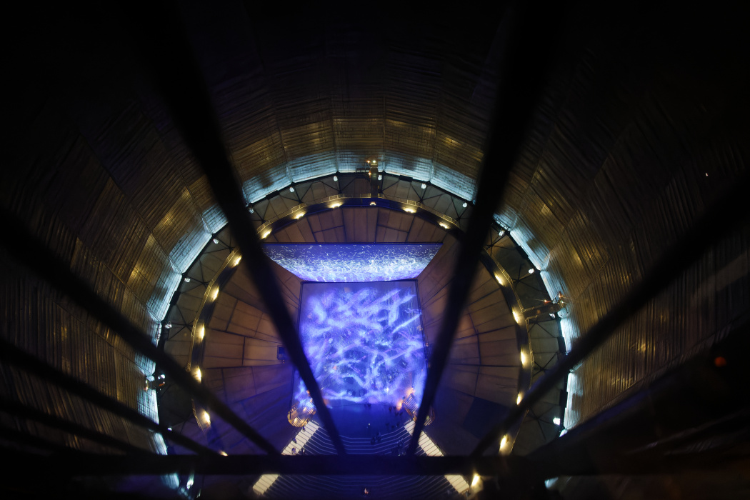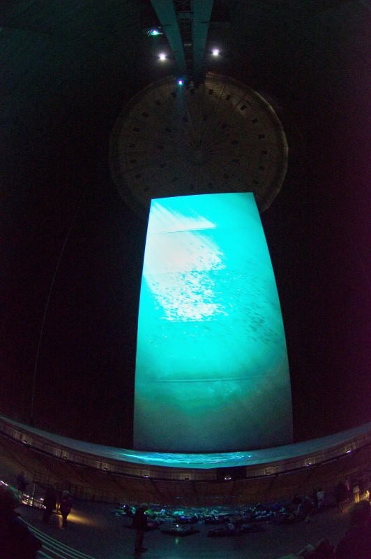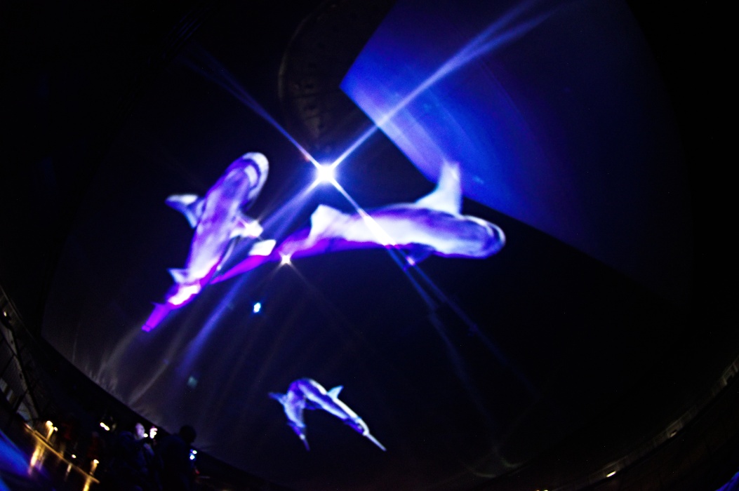 ガソメーターの特徴的な大空間を活かし、最上階のドーム内では迫力ある投影を駆使して海底を再現しています。