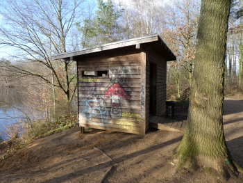 | 散歩道はホンの僅かな場所だけ湖を横切る | この小屋から鳥を観察できる。毛布も置いて有る |