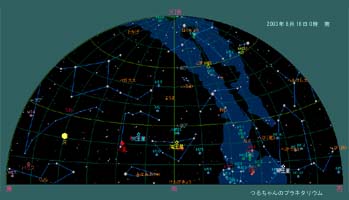 火星大接近の影になってしまっているのが、ペルセウス座流星群。残念ながら今年は極大時が満月に当たり、明るい流星しか見ることが出来ません。それでも視界に月が入らないような方向へ目を向けて観望しましょう。この流星群はかなり明るい流星が多いので、十分楽しめると思います。 8月16日0時頃の空