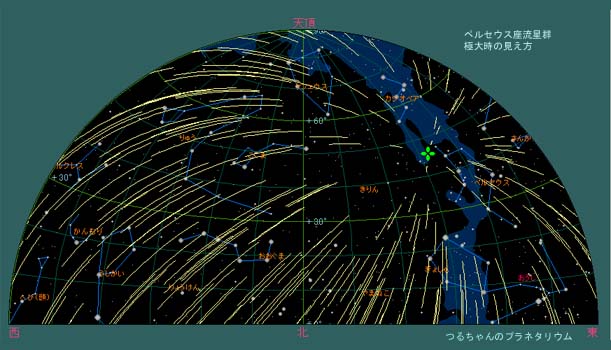 ペルセウス座流星群: しし座流星群に次ぐ明るい流星が派手に飛ぶペルセウス座流星群。今年は残念ながら満月にぶつかってしまい、かなり明るい流星しか見えないでしょう。月が無ければ一時間に60個〜100個位は見れるでしょう。