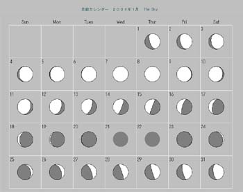 2003年の平均気温は史上第三番目、夏の気温は史上最高となりました。 まぁ、幾ら文句を言っても、やはり冬は寒いです。南西に輝く-4等の金星が大変寒い印象を与えます。 1月1日午前0時、小惑星セレスがちょうど双子座のカストルとポルックスの間に入り、大変見つけ易くなります。6.8等と大変くらいのですが、条件がよければ双眼鏡でも十分に観望できます。又、土星も双子座にいるので、一見の価値は有ります。又、セレスは15日位迄ゆっくりとポルックス(左)からカストル(右)へと渡って行くので、元旦に見損なっても、未だチャンスは有ります。是非試してください。(下記惑星項目参照) 1月の空はオリオン座、おうし座、アンドロメダ座、大熊座(北斗七星)、カシオペア座、ペルセウス座、ぎょしゃ座などのを代表する星空も賑やかな冬の星座が空を飾ります。