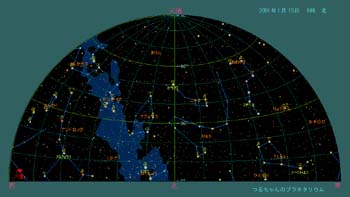 9月に大接近した火星も既に西に傾き、その輝きを次第に失ってきましたが、まだまだ明るい赤い星として目を聞きます。12月31日に衝を迎えた土星は双子座と共に午後16時半には東の空に上り、一晩中観測出来るでしょう。木星は月初めは夜22時過ぎに東の空に上り、月末迄には20時30分にはその姿を見せ-2.4等迄明るくなります。 1月15日0時頃の空