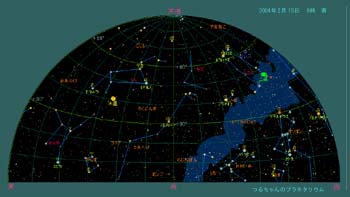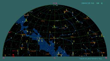 オリオン座も早い時間に上り、双眼鏡で三ツ星の下に有るオリオン座大星雲(M42)を観望するのも良いでしょう。望遠鏡があれば真中に若い星達の姿が見えます。大熊座(北斗七星)のミザールは2重星、空の暗い所では肉眼でもアルコルという星がぴったりくっ付いているのが確認できます。アラビアでは目の検査に使われたそうです。一度試してみてはいかがでしょう。 2月15日0時頃の空