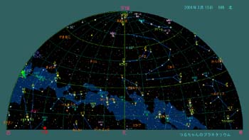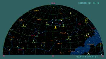 冬の賑やかな星たちも次第に西に傾き、目立たないうみへび座、コップ座、おとめ座、からす座などが東の空にに上ります。春の空で比較的目立つのが、流星群で有名なしし座と牛飼い座です。かんむり座も牛飼い座のそばに有り、大きなU字型をしているので、明るくは無いですが、見つけやすいでしょう。 3月とは言っても、まだまだ寒い日は続きます。空がおとなしい星座に入れ替わりましたが、日没時に見える金星、そしてまだ明るい火星が西の空に輝き、土星、木星と次々と東の空に姿を見せます。その中でも南西に輝く-4等の金星が特に寒い印象を与えます。 春の空には目立った星雲、星団はありませんが、早い時間であれば西の空に輝いている冬の星座の間を双眼鏡で散歩するのも良いでしょう。 3月15日0時頃の空