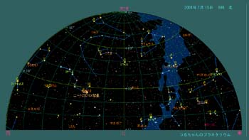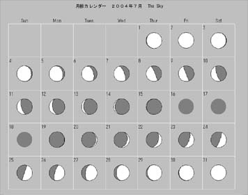 日付 出 正中 没 01 7 2004 6:17:21 14:26:29 22:34:01 11 7 2004 7:18:48 14:58:51 22:36:52 21 7 2004 8:04:14 15:12:24 22:18:48 31 7 2004 8:26:12 15:07:08 21:46:48