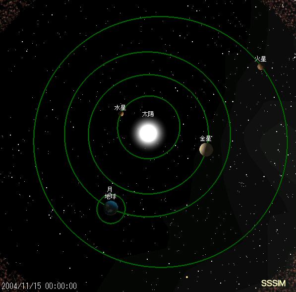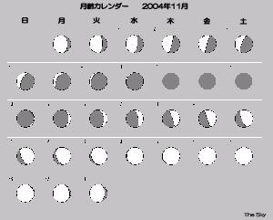 日付 出 正中 没 01 11 2004 3:49:55 9:53:27 15:55:52 11 11 2004 4:17:44 9:59:12 15:39:37 21 11 2004 4:46:27 10:05:50 15:24:15 01 12 2004 5:15:58 10:13:52 15:10:55