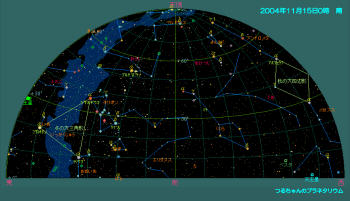 又、8月下旬に発見されたマックホルツ彗星が徐々に北上して来ます。未だ暗く南の空の大変低い場所に居るので、肉眼や双眼鏡での観望は無理でしょう。12月になれば見ごろになってきますので、期待していて下さい。 今月の星空は秋の星座で一杯です。天の川はちょうど西から東へを天を横切ります。アンドロメダ座と秋の四辺形が天頂に、白鳥座、わし座、こと座などの夏の大三角を形作る星座が西の空に、東からはプレアデス星団(M45)、ヒアデス星団に続いてにぎやかな冬の星座が昇ってきます。大きな5角形のぎょしゃ座の目に付きます。北斗七星は北の空低くひしゃくを上にして横たわり、南には目立たない星座が多い中、秋の星で唯一の一等星フォーマルハウトが地平線低く輝いています。 双眼鏡で観望出来る天体はアンドロメダ大星雲(M31)とオリオン座大星雲(M42)。しかしアンドロメダ大銀河は天頂にあるので、ちょっと見づらいかもしれません。 11月の天気11月15日0時頃の空