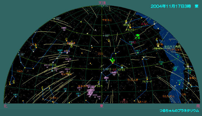 しし座流星群 2004年のしし座流星群は11月13日から20日頃まで活発な活動を見せてくれます。流星予報によると極大時は17日3時頃、一時間に約20〜30個ほどの流星が観望出来るでしょう。活動時期には新月の直後なので観望条件は良好ですが、今年は余り目立った活動は予想されていません。それでも未だ知られていないダストトレイに突入する可能性も有りますので、是非観望して下さい。