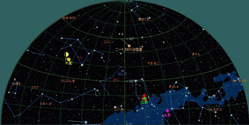 順調の明るくなっているニート彗星(NEAT C/201 Q4)とリニア−彗星(LINEAR C/2002 T7)が日没直後の西の空に出現します。 下記のグラフの様に南に移動すればするほど日没時間が早くなるので観望には大変都合が良いでしょう。ドイツ(北緯50度)よりカナリア諸島(北緯28度)が観望地をして適しているのが分かります。休暇をかねて南国へ旅行してみるのも悪くないかもしれません。 5月17日テネリフェ島から見たニート彗星。
