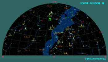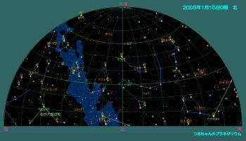 双眼鏡で観望出来る天体はプレアデス星団(M45)、ヒアデス星団、アンドロメダ大星雲(M31)とペルセウス座の2重星団(h-χ、エイチ・カイと読む)、散開星団(M34)とオリオン座大星雲(M42)。オリオン座にはウルトラマンの故郷「M78星雲」も有りますが、これは望遠鏡が無いと見えません。おおぐま座の子連れ星雲(M51)と銀河カップル(M81とM82)は是非一度大型の望遠鏡で観望して下さい。 1月の天気1月15日0時頃の空