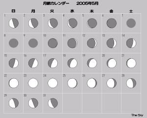 日付 出 正中 没 01 5 2005 3:54:16 8:53:56 13:54:07 11 5 2005 3:30:04 8:42:18 13:55:05 21 5 2005 3:05:05 8:30:05 13:55:40 31 5 2005 2:39:31 8:17:21 13:55:46