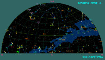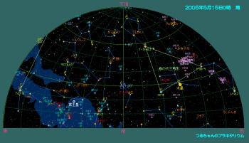 空はすっかりおとなしい春の星座に入れ替わりました。 日も長くなり、空が完全に真っ暗になるのはほんの7時間程です。 暗くなる頃には北斗七星やしし座がほぼ天頂近くまで昇ってきます。東の空には夏の星が見え出しています。特に目立った星は有りませんが、ヘルクレス座の散会星団M13やおおぐま座の親子銀河M51などが天頂に昇り望遠鏡での観望がし易くなります。