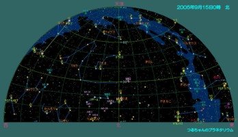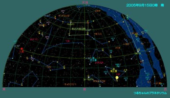薄明後の空はまだまだ夏の星座で空は一杯です。昼と夜の長さが同じになる28日の秋分の日を迎えるまでには、秋の四辺形(ペガスス座)が次第に高度を上げてきて、夜空は秋の星座に入れ替わります。あの有名なアンドロメダ大星雲(M31)も見ごろになってきました。夜半過ぎには双子座やオリオン座等の冬の星座が東の空に上ってきます。やっと夜が長くなり、星好きには良い季節となりました。