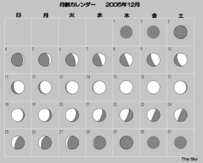 日付 出 正中 没 01 12 2005 11:24:37 15:17:52 19:11:33 11 12 2005 10:55:17 15:02:10 19:09:33 21 12 2005 10:12:54 14:33:23 18:54:20 31 12 2005 9:16:07 13:48:18 18:20:52