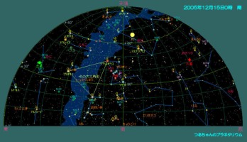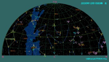 惑星たちも夕暮れから夜明けまで交代で登場し、12月の夜空は大変賑やかになります。12日には火星が月に1.8度迄近づきます。是非観望して下さい。 双眼鏡で観望出来る天体はプレアデス星団(M45)、ヒアデス星団、アンドロメダ大星雲(M31)とペルセウス座の2重星団(h-χ、エイチ・カイと読む)、散開星団(M34)とオリオン座大星雲(M42)。オリオン座にはウルトラマンの故郷「M78星雲」も有りますが、これは望遠鏡が無いと見えません。おおぐま座の子連れ星雲(M51)と銀河カップル(M81とM82)は是非一度大型の望遠鏡で観望して下さい。 12月の天気 12月15日0時頃の空